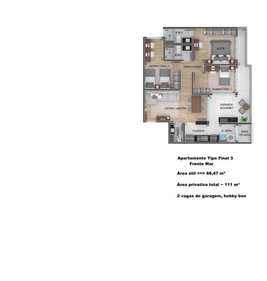 - Área Privativa: 86,50 m²